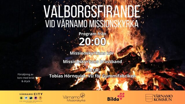 Traditionellt valborgsfirande framför Missionskyrkan. Missionskyrkans kör, Missionskyrkans brassband, Tobias Hörnquist. Brasan i Lagan tänds av scouterna.