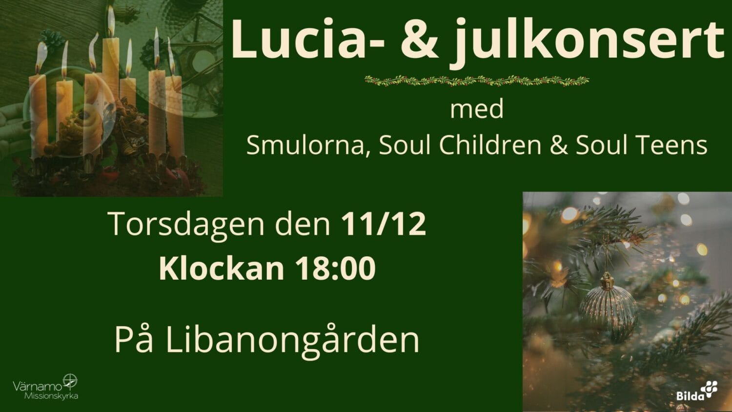 Välkommen på lucia- & julkonsert med Smulorna, Soul Children & Soul Teens. Torsdagen den 11/12 klockan 18:00 på Libanongården.